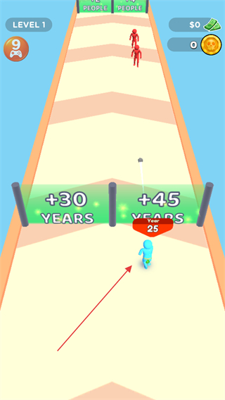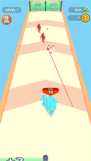 1、操控角色在跑道上选择+30YEARS+45YEARS等区域,增加人群数量与年龄。