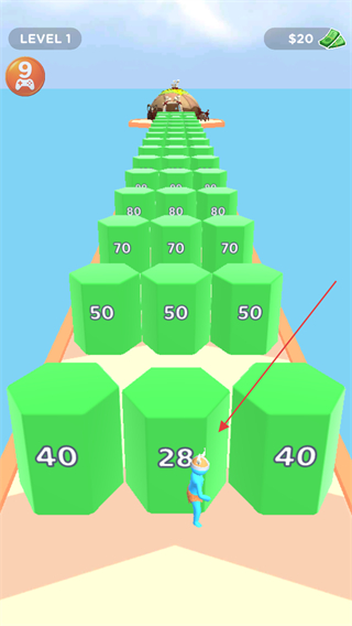 2、躲避障碍物,与红色人群碰撞合并,壮大自身人群规模,积累金币。
