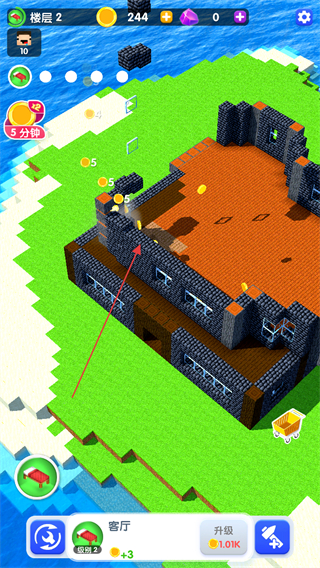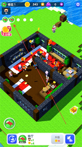 2、升级客厅等建筑,吸引居民入住,增加金币收益。