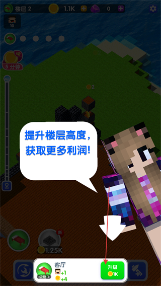 3、点击升级提升楼层高度,获取更多利润,解锁楼层2。