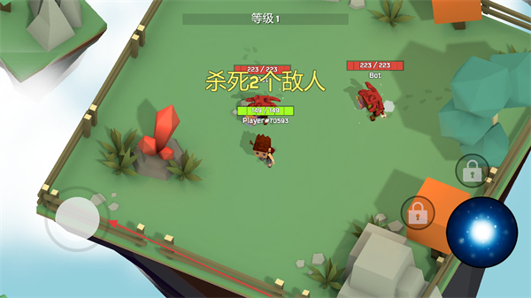 1、操控左侧移动摇杆控制角色移动,靠近红色敌人,发动攻击,目标是杀死指定数量的敌人。