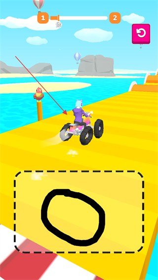2、绘制图形生成四轮车,操控其在黄色赛道上行驶,躲避障碍物,收集道具。