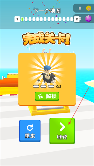 4、完成关卡后,点击继续按钮进入下一关,也可选择重来或解锁新内容。