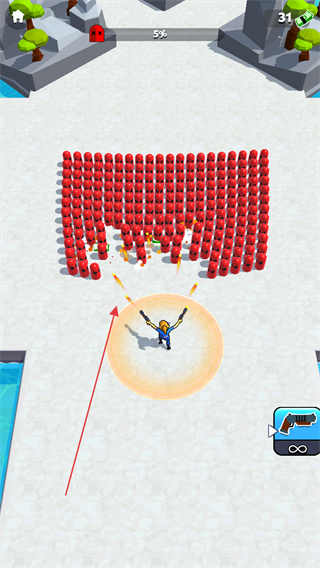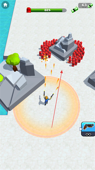 1、操控角色移动,接近红色敌人集群时会自动射击,消灭敌人以推进关卡进度如进度条从54%到88%再到100%。