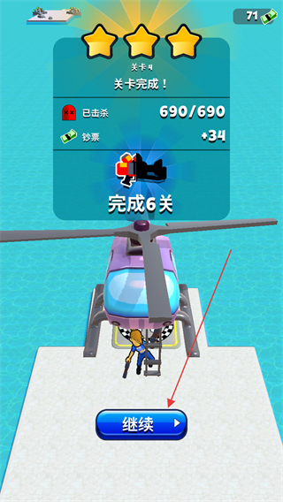 4、到达停机坪后,关卡完成,可查看已击杀敌人数量、获得的钞票等信息,点击继续进入下一关,继续挑战。
