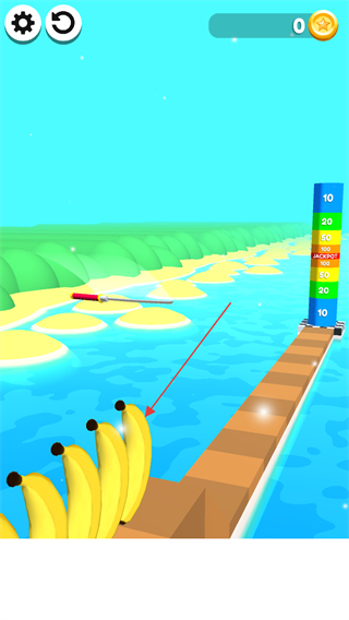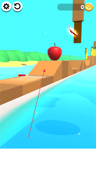 1、操控刀具在跑道上移动,砍击苹果、香蕉等水果,收集水果以增加分数和金币。
