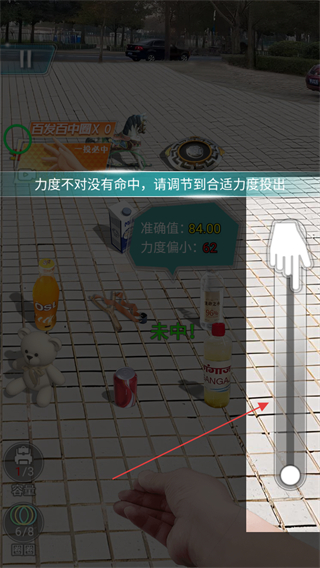 2、根据提示调节力度值,避免力度偏小,调整至合适力度投圈以命中物品。