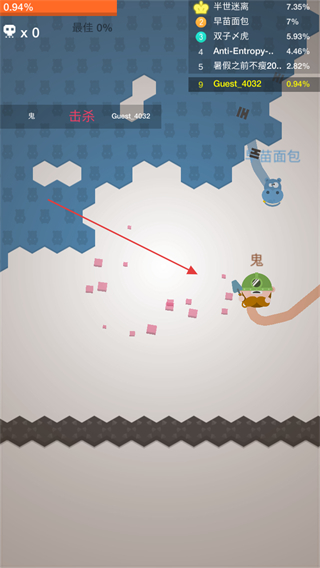 1、进入游戏,操控代表自己的Guest_4032圆圈,在六边形地图上移动来占领空白区域,扩大自己的势力范围。