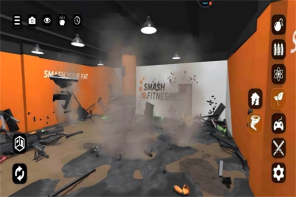 3、继续利用工具对健身房内其他物品,如健身器材等,进行破坏或移动,改变场景布局。