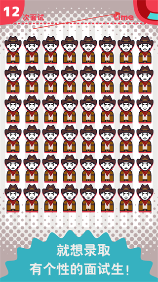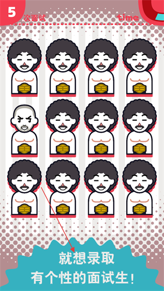 1、进入第5次面试关卡,在众多形象相似的面试生中,找出形象独特的那位并点击选择,目标是录取有个性的面试生。