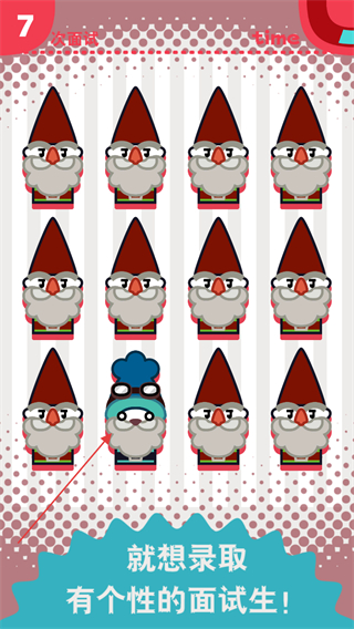 2、在第7次面试里,继续从一排面试生中,识别并点击与其他形象不同、更具个性的面试生。