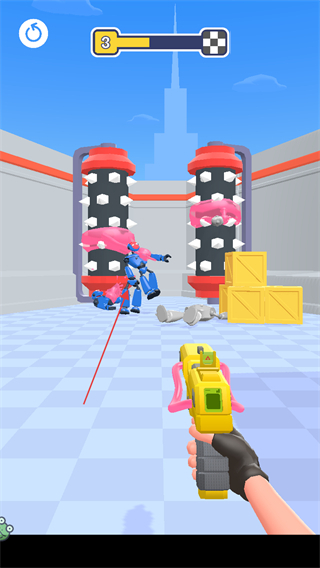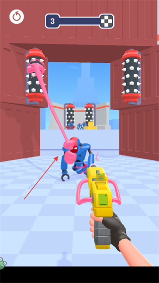 1、进入第3关游戏场景,操控手中的黏胶枪,点击屏幕上的橡皮敌人发射黏胶进行攻击。
