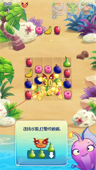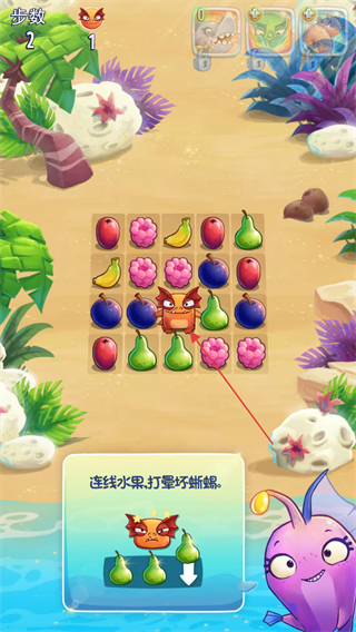2、进入关卡后,根据提示连线水果打晕坏蜥蜴,在棋盘上连线相同水果进行消除。