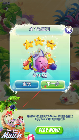 4、成功击败蜥蜴后,显示第1关通过!,查看得分,点击下一步进入下一关。