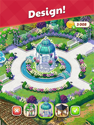 装饰品涵盖花卉盆栽、庭院路灯、休闲座椅等,不同关卡奖励对应不同装饰,可按喜好搭配,打造专属风格的花园。