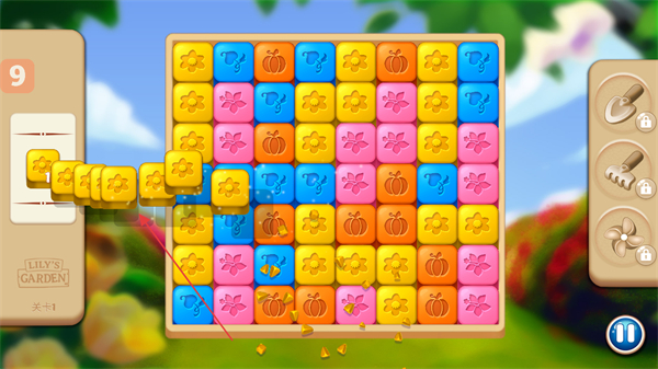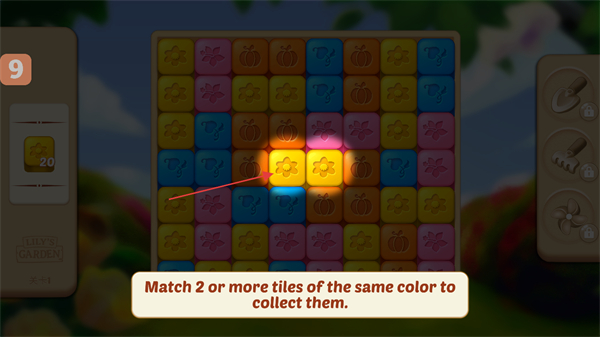 1、留意屏幕提示,需匹配2个及以上相同颜色方块来收集它们,左上角显示剩余步数为9。