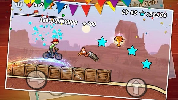 单车男孩是一款横版自行车跑酷类休闲益智作品,以障碍躲避分数收集为核心玩法,操作逻辑简单易上手,使用者操控自行车在横版赛道上前进,通过触发加速、跳跃等动作,避开石头、箱子、乌鸦等沿途障碍物,同时收集星星与奖杯提升分数,包含三种不同主题的关卡,搭配上百个差异化关卡设计。