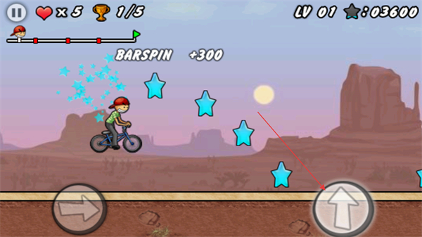 2、骑行过程中,遇到蓝色竖杆障碍,及时点击右侧JUMP按钮控制男孩跳跃躲避。
