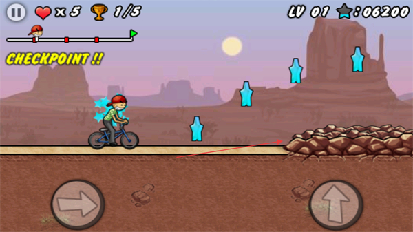 4、骑行至CHECKPOINT!标记处,代表通过一个检查点,持续骑行并躲避障碍,完成关卡。