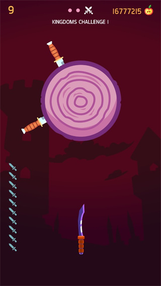 2、持续发射飞刀,注意躲避四处飞溅的飞刀,击中苹果可获额外奖励。