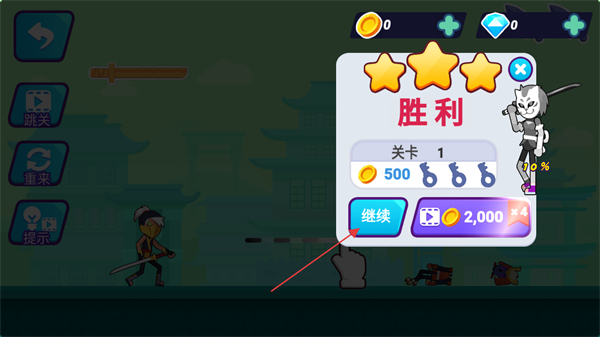 4、成功击败关卡内所有敌人后,点击继续按钮,进入下一关。
