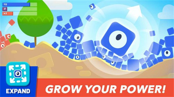 1、进入游戏,看到上方提示Reach100evos,点击屏幕下方技能图标发射蓝色方块。