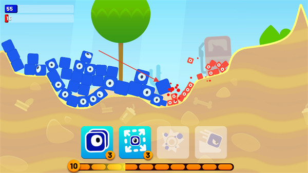 4、遇到红色方块敌人,利用分裂出的大量蓝色方块攻击并消灭它们。