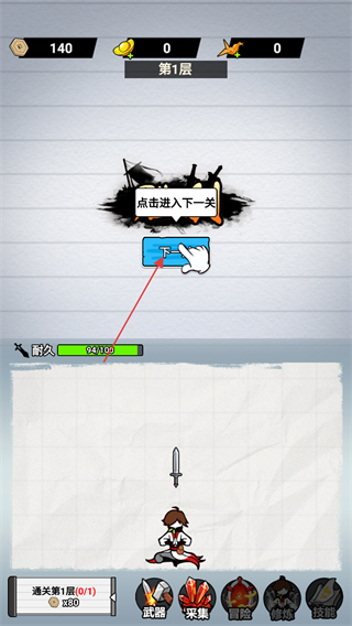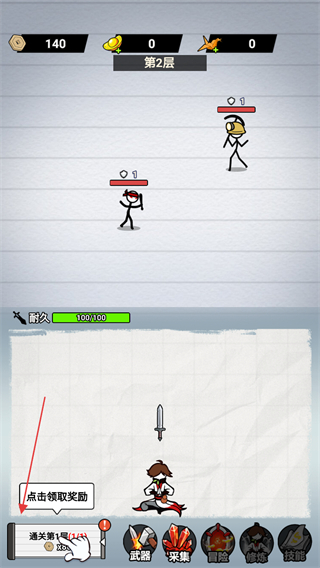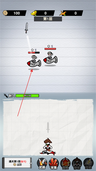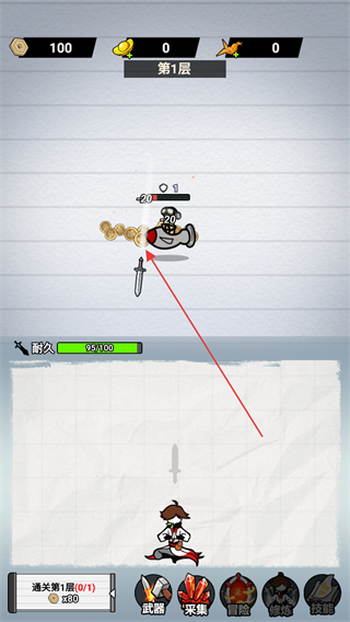 1、进入游戏,看到屏幕上方显示第1层,操控角色出剑攻击敌人,击败敌人获取金币。