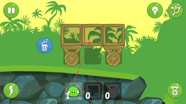 1、进入游戏,观察关卡场景,看到木车等道具,思考如何利用道具让猪到达目标位置。