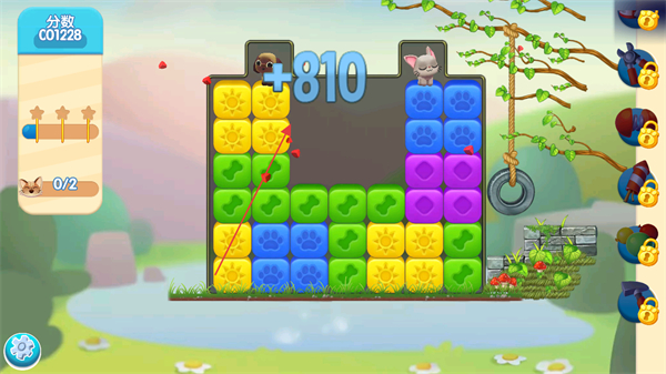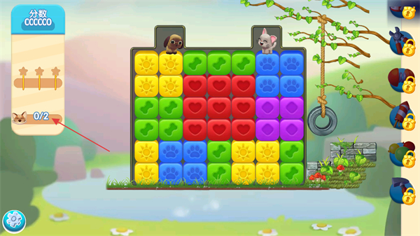 2、留意屏幕左侧显示的需要营救的宠物数量如0/2,通过点击或滑动,让3个及以上相同颜色的方块相连进行消除。