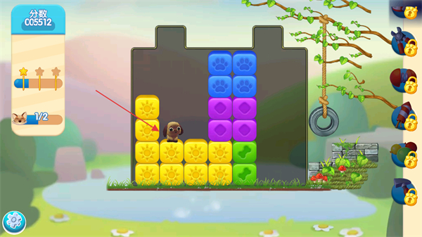 4、持续消除方块,为宠物开辟下落通道,让宠物成功落到下方,完成营救任务。