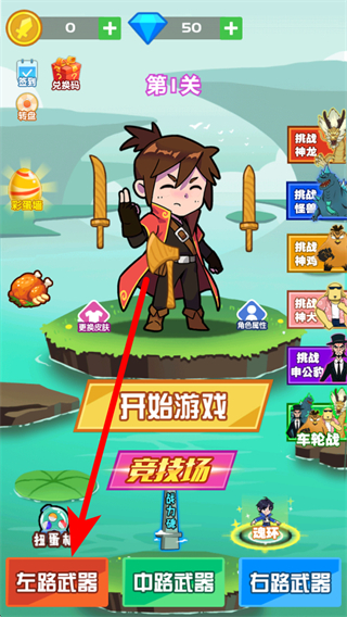 3、还可通左路武器、中路武器、右路武器等选项,查看与选择不同类型的武器,了解它们的攻击数值与耗蓝情况,为战斗做好武器准备。