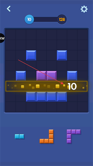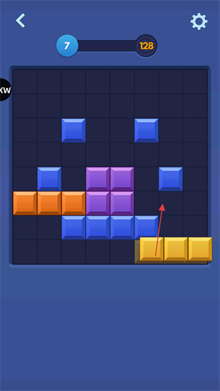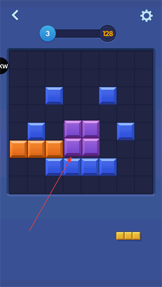 2、点击或拖动下方方块到上方棋盘合适位置放置,使方块组成完整一行或一列。