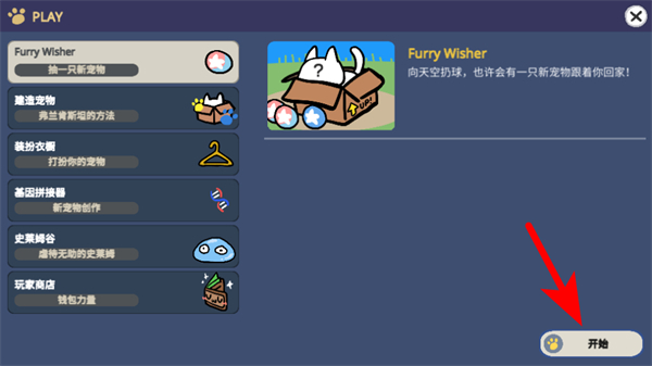 3、在功能菜单界面,点击开始按钮,进入宠物抽取或相关游戏环节。
