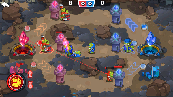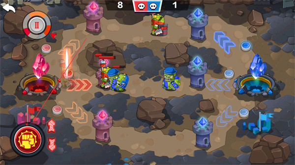 1、红蓝双方玩家分别操控己方僵尸部队,向对方的水晶基地发起进攻,通过部署不同类型的僵尸,利用地形和防御塔的配合,突破敌方防线。