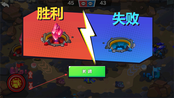 4、最终以摧毁对方水晶基地为目标,率先达成的一方获得胜利,反之则失败,战斗结束后点击关闭按钮,可进入下一场对战或结算界面。