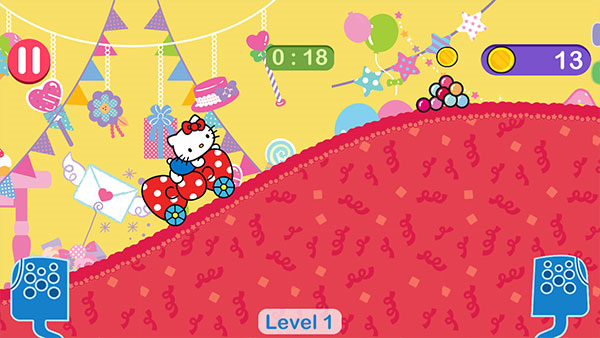1、操控凯蒂猫驾驶小车在生日主题跑道上行驶,注意时间限制,收集金币。