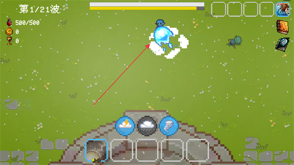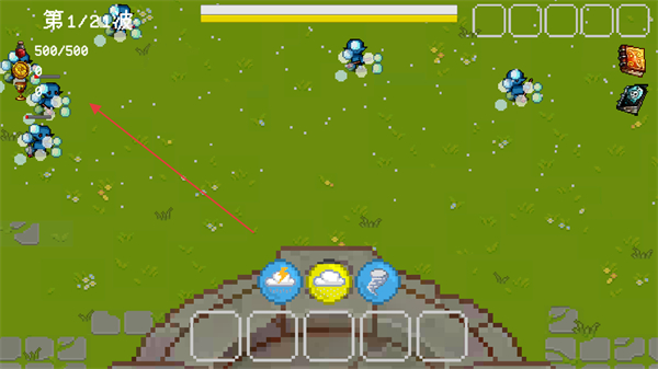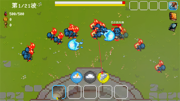 4、切换使用不同天气技能,如旋风,攻击大量红色敌人,碾碎它们推进关卡。