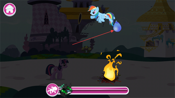 2、让彩虹小马携带水球,投向火焰,熄灭火焰推进任务。