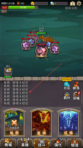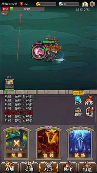 1、操控战士在地图如黑锋丛林中自动战斗,攻击怪物获取经验和金币。