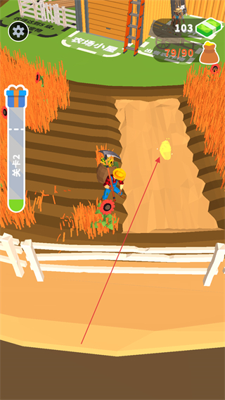 1、操控角色在农田中收割农作物,同时挖掘土地获取资源,积累农作物数量。
