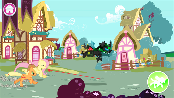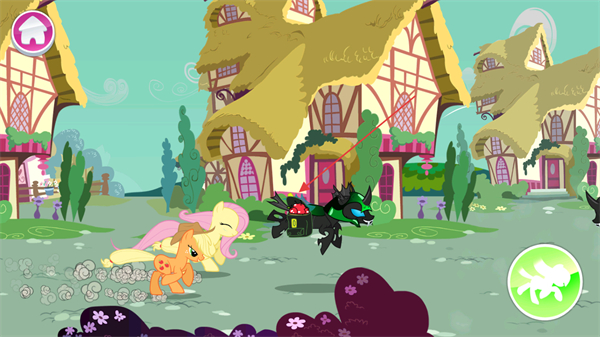 1、操控小马在小镇中奔跑,躲避黑色反派的追击。