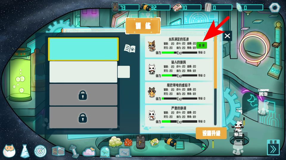 3、进入训练界面后,选择可训练的猫咪,点击选择按钮,这是提升猫咪属性的关键操作,准确选择后可开展训练,增强猫咪的各项能力,助力后续冒险。