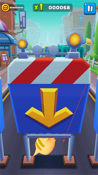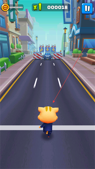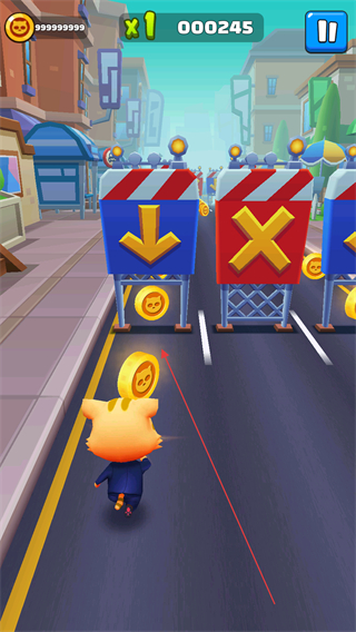 1、遇到前方有汽车和路障时,通过左右滑动切换跑道,躲避障碍物继续奔跑。