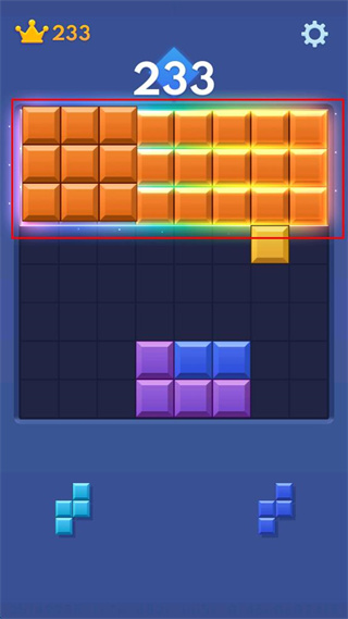 4、分数233皇冠233时,处理红色方框内橙色方块,移动底部方块与之相连,触发多排消除获得高分。