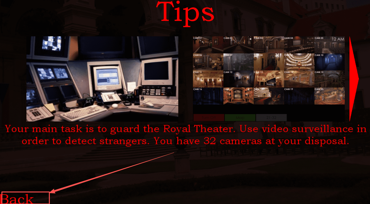 1、玩家首先需要熟悉监控系统,利用遍布宫殿的三十个摄像头观察对手动向,制定防御策略同时收集场景中散落的工具与线索。