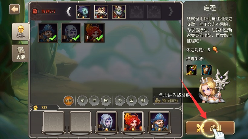 4、从英雄列表中挑选合适的出战角色,点击战斗开启这场自动回合制对决。