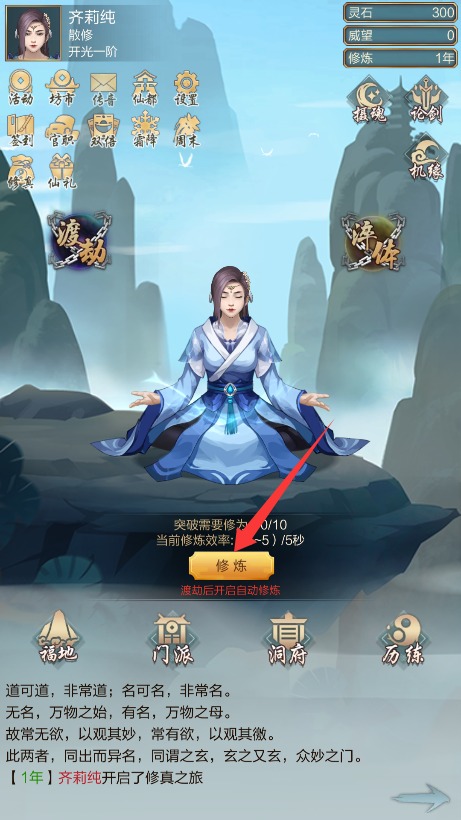4、进入主界面后立即点击开始修炼功能,吸纳天地灵气迈出修仙第一步旅程。