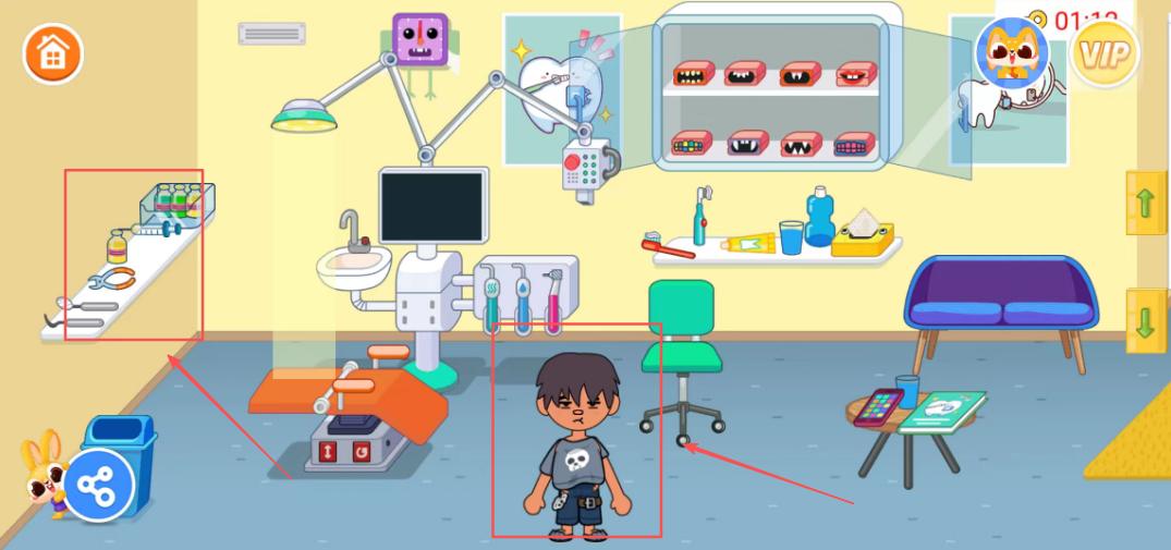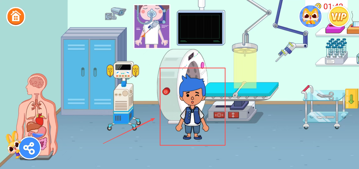 1、选择医生角色进入游戏,了解医疗器械用途和基本医疗操作流程,认识常见医疗工具的名称和功能,建立基础医疗认知。