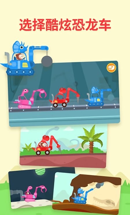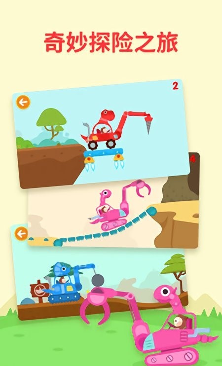 2、驾驶恐龙车穿越各种场景,完成寻找宝石、解救动物等任务,体验冒险乐趣,培养方向感和空间认知能力,提升观察力和环境适应能力。